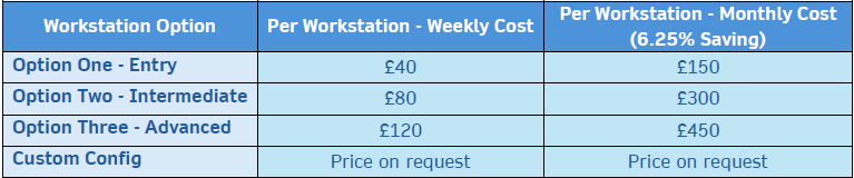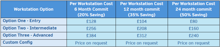 Per user, per week or per month models available, with contracts from 1 week to 36 months, with all the benefits of VDI, but with no virtualisation layer.